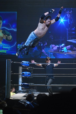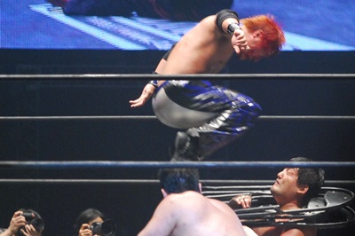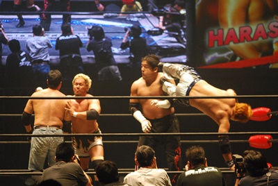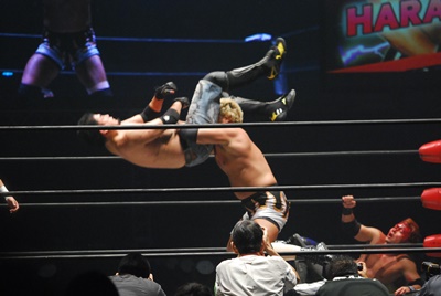 石川HARASHIMAをコーナーに振って突っ込む、HARASHIMAカウンターのキックから正面跳びドロップキック(右写真)、真壁にタッチ。