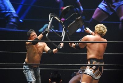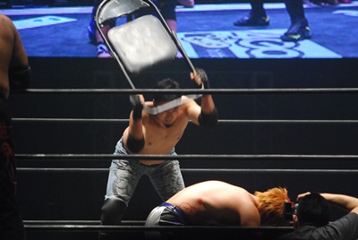 伊東はイスで背中を乱打(左写真)、イスの上へのボディスラムで曲がったイスを元に戻す。石川にタッチ。