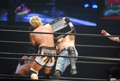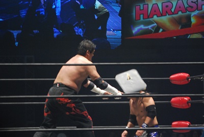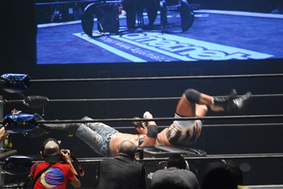 石川ロープに飛ぶ、HARASHIMAカウンターのジャンピングハイキック。テーブルへのファルコンアロー(左写真)、カウント2。