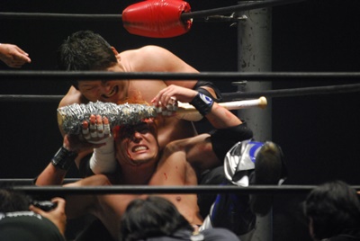 真壁が有刺鉄線バットを持ってリングイン、2人を打つ(左写真)。