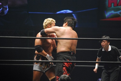 真壁とHARASHIMAを同士討ちさせようとするが切り返されて逆に同士討ちに。HARASHIMAドロップキック、真壁ラリアット(右写真)。HARASHIMAと石川は場外に。