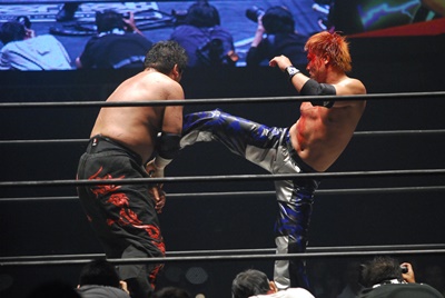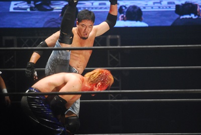 伊東をリングに戻して「チェストー!」(左写真)ミサイルキック、カウント2。真壁にタッチ。