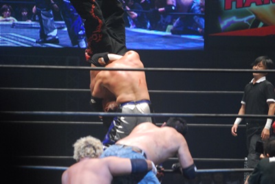 伊東コーナーに振る、HARASHIMA切り返して突っ込む、伊東コーナーで捕えてタランチュラ(左写真)。真壁がカット。
