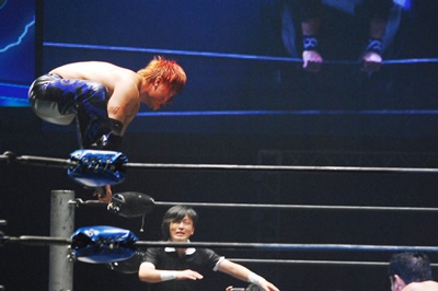 伊東がムーンサルトプレス狙って背中向きにコーナーに上る、真壁も上ってスパイダージャーマン(右写真)。
