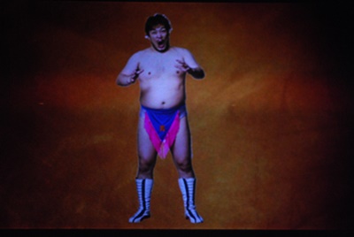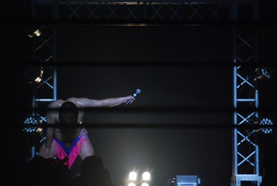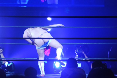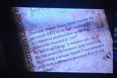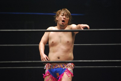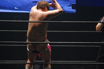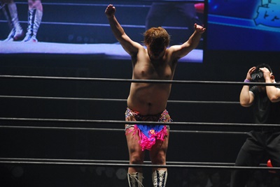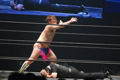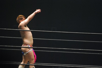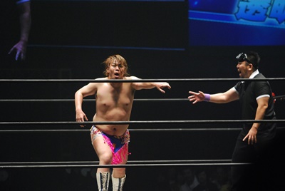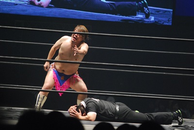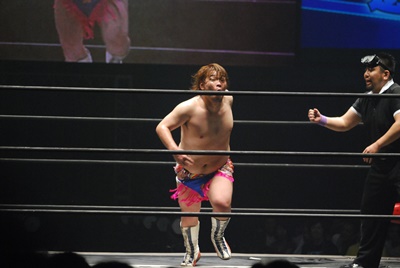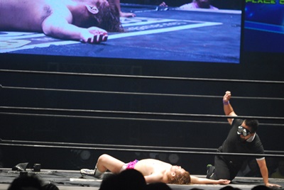 マイクを取ると透明人間に向ける。透明人間(声は高木)「DDTを旗揚げして15年、いろいろあったよ。でもそんなこと、これから始まる歴史に比べたらどうってことねえよ!メインではDDTの未来を見せてやる。おい、心の準備はいいか?ミュージック、スタート!」(左写真)すぐにケニー・オメガのテーマ。これは凄い。凄いとしか言いようがない。