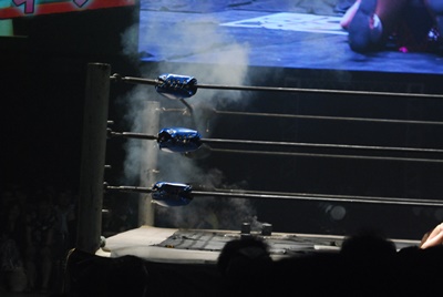 2発目まではこらえていたディーノが3発目でついにロープに接触(右写真)。3発目の爆破は四面全部だ!