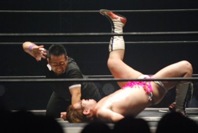 ディーノは松井レフェリーを伏せさせて(左写真)、