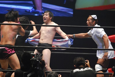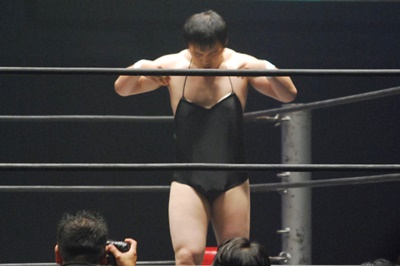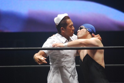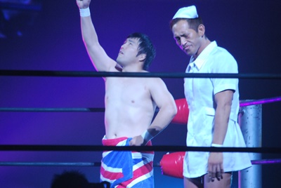 ド変態團が入場。マイケルはナース服、佐藤は腰にタオル一枚(右写真)。下は?