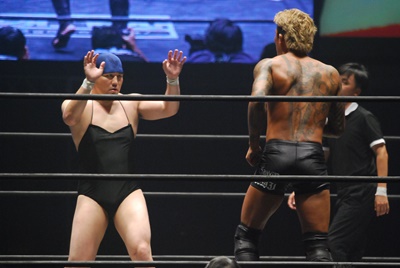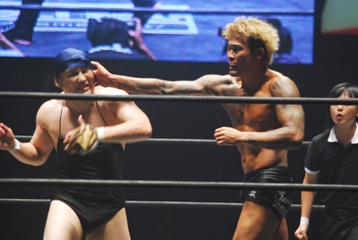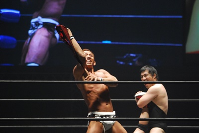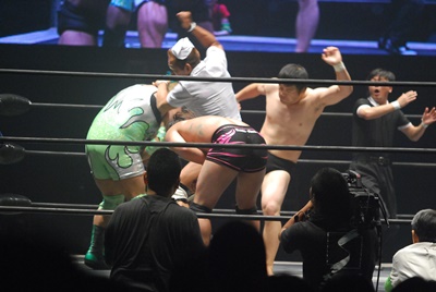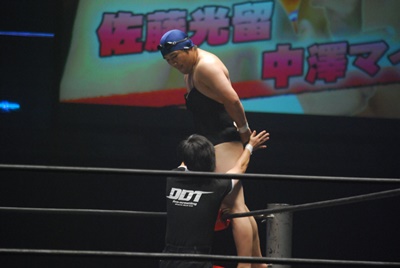 マイケルはヘンタイスライド(左写真)からアトミックドロップ、カウント2。佐藤にタッチ。