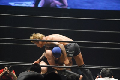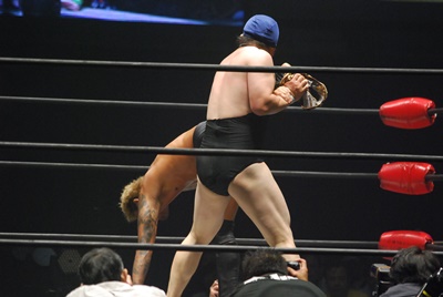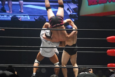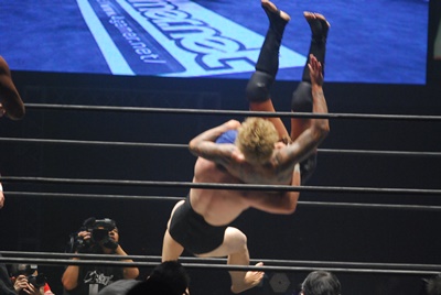 佐藤ローキック、高尾の首にエルボースタッブ、マイケル入ってコーナーの坂口にドロップキック、佐藤とダブルのブレーンバスター(右写真)、マイケルがカバー、カウント2。