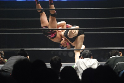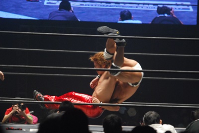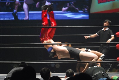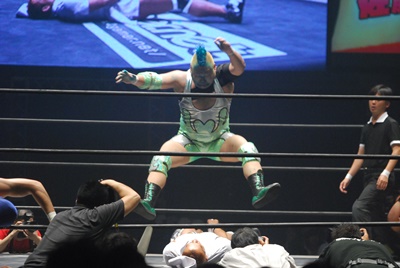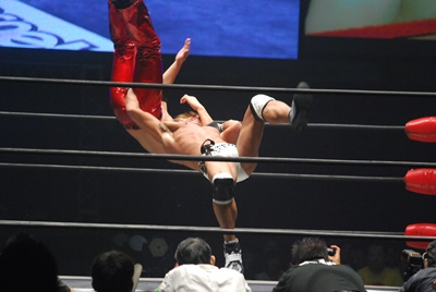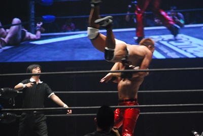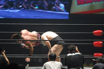 マイケルコーナーに上ってダイビングショルダーブロック(右写真)。バックフリップ狙うが高尾ブロックしてマッスルストンプ。