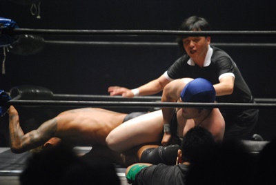 ジャンピングDDT(右写真)、コーナーに振る、佐藤切り返して突っ込む、石井回転エビ固めに、カウント2。