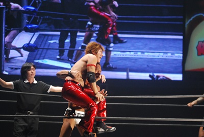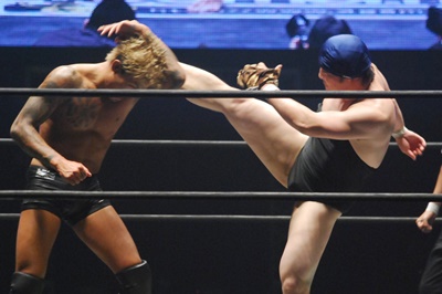 佐藤首投げからサッカーボールキック(右写真)、カウント2。ターンバックルにぶつけてマイケルにタッチ。2人で踏みつけ。