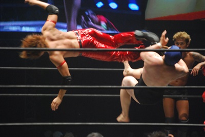 佐藤キック、高尾エルボーの打ち合い、佐藤キック連打、高尾ロープに振ってドロップキック、佐藤ロープにつかまってスカす、佐藤ロープに飛ぶ、高尾前転からドロップキック(右写真)、坂口にタッチ。