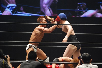 坂口ハイキック、佐藤もハイキック(左写真)、ダブルノックダウン。両軍タッチ。