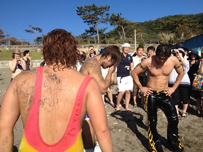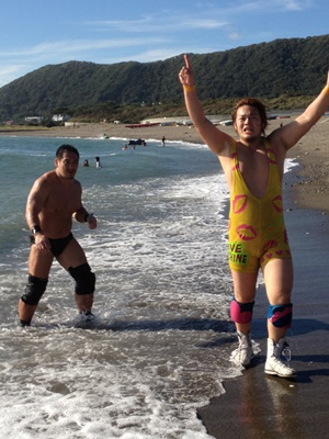 海でのプロレス、似たようなことは男なら誰でも経験あるが、プロ(しかも飯伏)がやるとこうなるよ、という感じ。最高に面白いが、これは平日少人数でしかできんなあ。そして砂浜を走るのは予想通りではあるが疲れる。