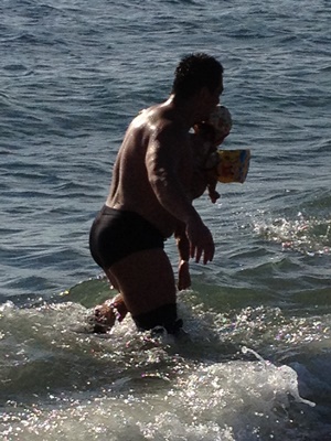 ここから先は自由時間。選手は海で遊んだりクラゲを採りにいったり(新藤のみ)海の家でくつろいだり。ファンも各自選手にサインもらったり写真撮らせてもらったり。大社長は海で遊んでいる子供のもとに向かう(右写真)。