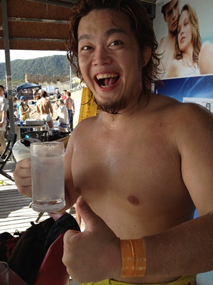 海の家でパーフェクトにレモンサワーを飲む福田(右写真)。
