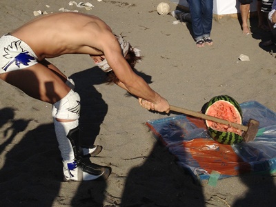 ハンマーの柄の部分で見事にスイカ割る(左写真)。