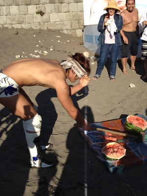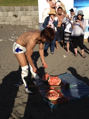 スイカを手で割って子供に配る飯伏(左写真)。包丁で切り分けるように指示されるが、包丁持たせとくといろいろ危ないので井上マイクに交代。