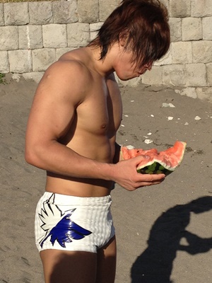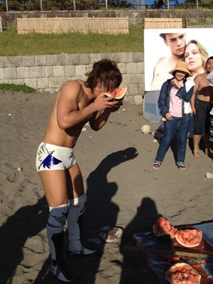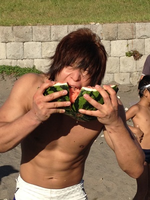 しかしそれはとりあえずおいといてスイカにかぶりつく飯伏(右写真)。
