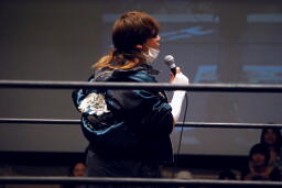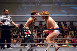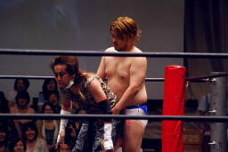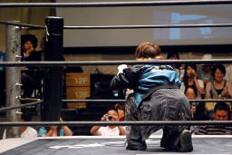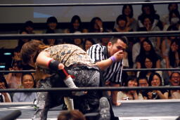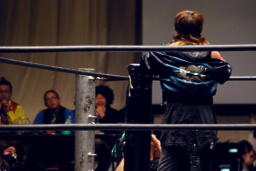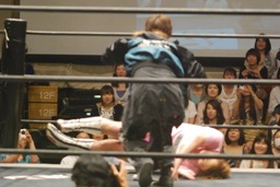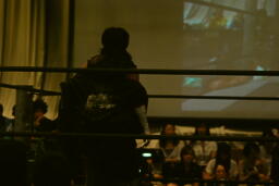 が、松井レフェリー聞こえなかったかのようにボディチェック完了。ここで新藤リングアナから「持ち時間5分経過!」のアナウンス。巻きだな。