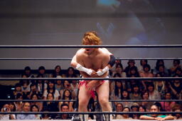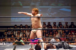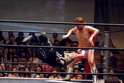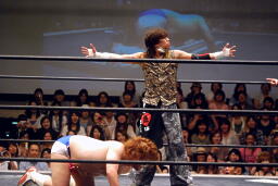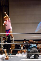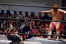 ディーノリングイン、いつものようにコーナーに。しかしマイクを取ると「私は男色ディーノ。ゲイレスラー。」と武道館での映像みたいな感じでモノローグ風のマイク。「私は気付いてしまった。DJニラがロケットパンチを打とうと待ち構えていることを。このまま入場ルーチンを続けるべきか、外に降りるべきか。えーいバカっ!いつもの入場ルーチンをやらないのは男色ディーノではない。正々堂々降りようと思う。」(左写真)
