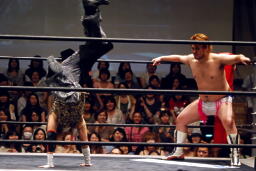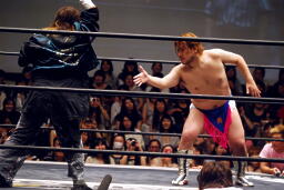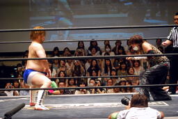 ニラ手を出す。ディーノ「私は男色ディーノ。DJニラが握手をしようと手を出していることに気付いてしまった。プロレスにおいて握手というのは奇襲を意味する。握手すると見せかけてレインメーカー式のロケットパンチを打ち込むだろう。だが、ルーティンワークを崩すのは男色ディーノではない。正々堂々と握手に応じてやる。」(右写真)