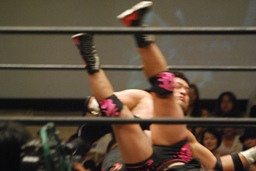 ドロップキック(右写真)、カウント2。