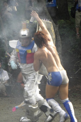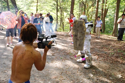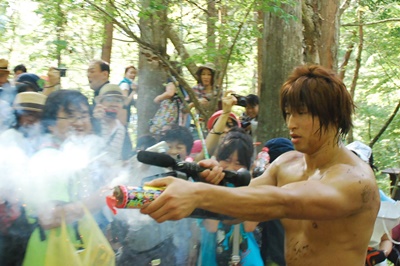 メカ三四郎との撃ち合いを自ら撮る飯伏(右写真)。殺人者目線のドキュメンタリー。