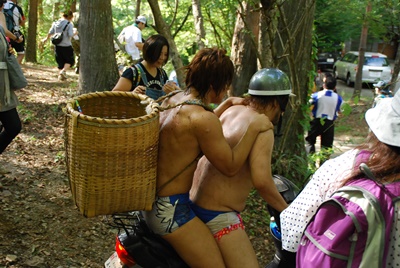 飯伏は背負子を担いでディーノのスクーターで移動(右写真)。