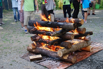 白樺広場に戻ると立派なキャンプファイヤーが(左写真)。悪い予感しかしない。