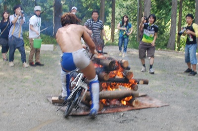飯伏はキャンプファイヤーに突っ込む(左写真)。