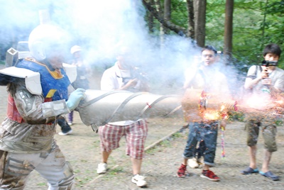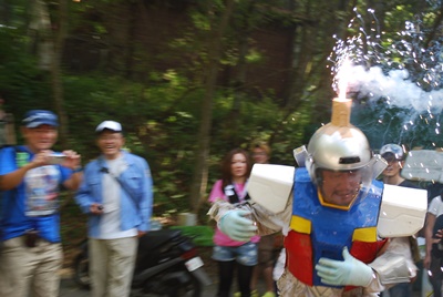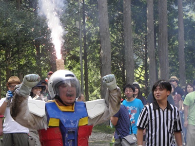 メカ三四郎は頭の花火に点火(右写真)。