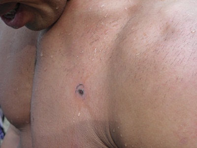 マイケルの左胸には穴のような火傷が(左写真)。