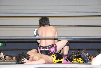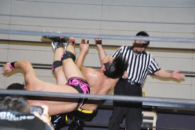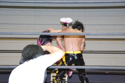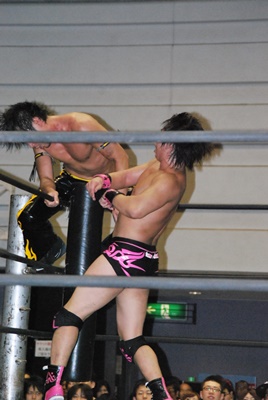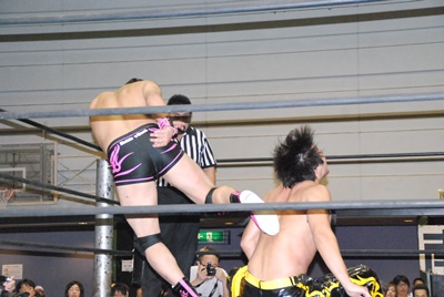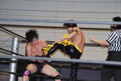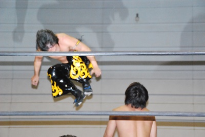 KUDOコーナーに上る、石井立ち上がってパンチ(左写真)、上る。KUDO突き落とす。石井再度上る、KUDO押し倒すと石井は逆さ吊りに。