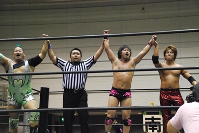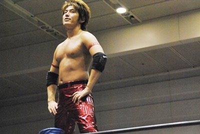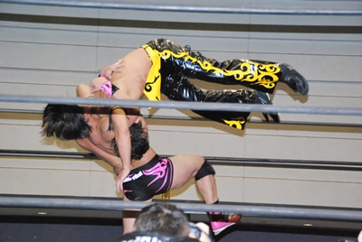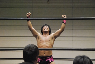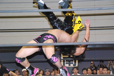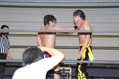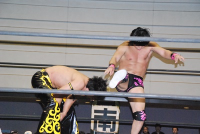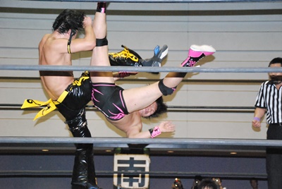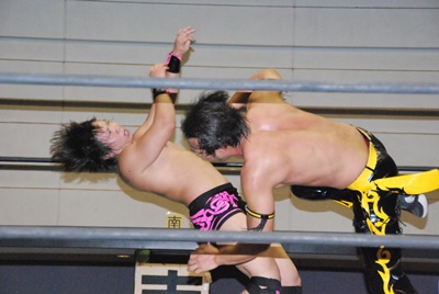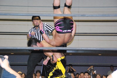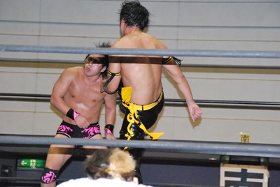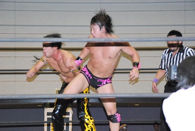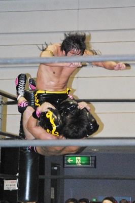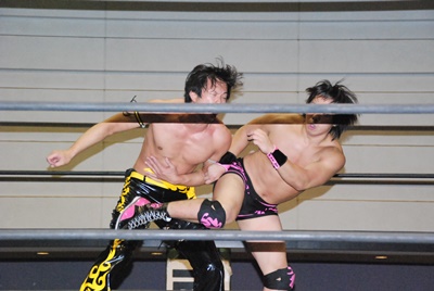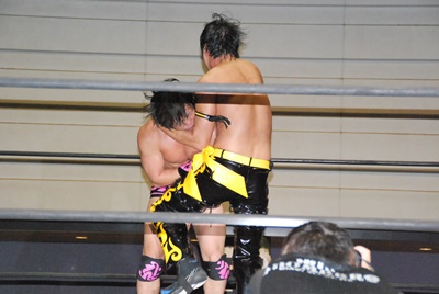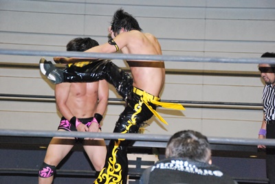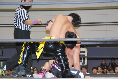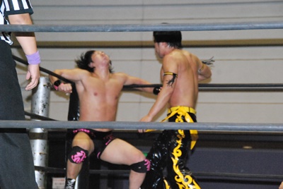 KUDOスワンダイブミサイルキック(左写真)、カウント2。首投げからスリーパー、石井ロープ。