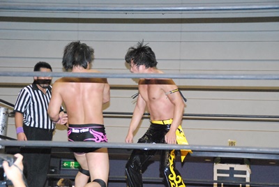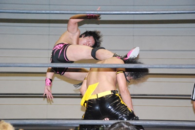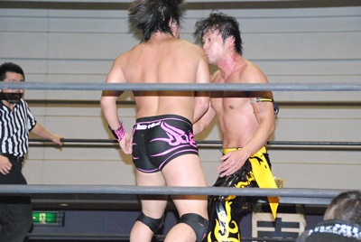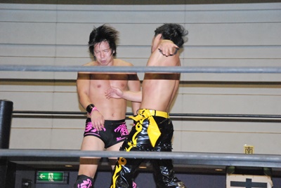 石井張り手(左写真)、フィッシャーマンバスター狙うがKUDOブロック。