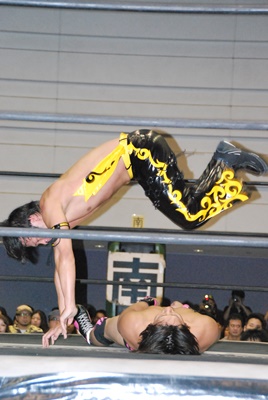 KUDOストンピング、ボディスラムから倒立式ダブルニードロップ(左写真)、カウント2。