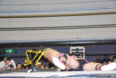 KUDOダイビングダブルニードロップ(右写真)、カウント2。