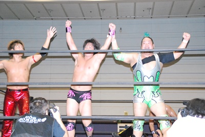 石井 「ドリフが勝ったぞ!今日はKUDOに勝った、次はHARASHIMAがいる。HARASHIMAも倒す。DDTは俺たちが中心に回らなきゃ、ダメだこりゃ!」(右写真)
