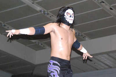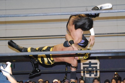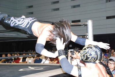 佐々木切り返してヘッドロックからフライングメイヤー(右写真)、HUBエビ固めに、カウント1。HUBヘッドシザーズでブレーク。