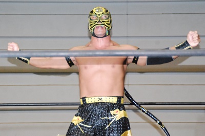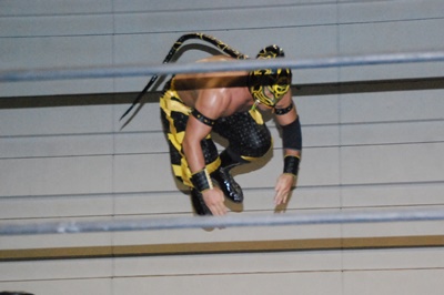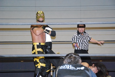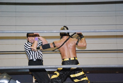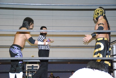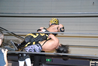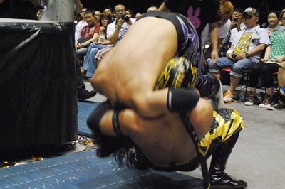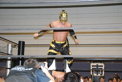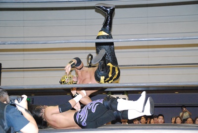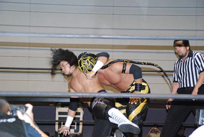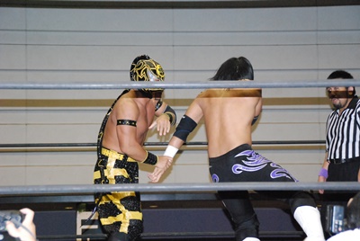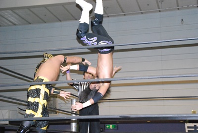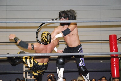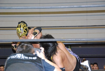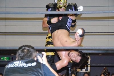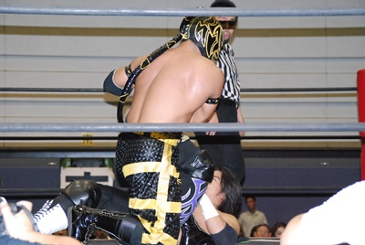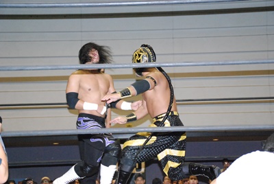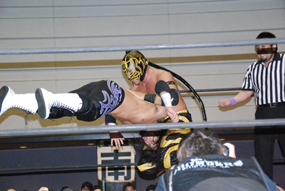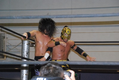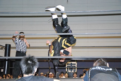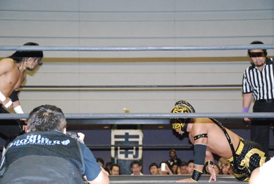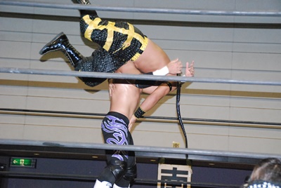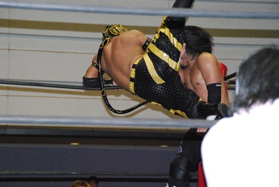 ジャックハマー狙うが佐々木は着地、HUBコーナーに振って突っ込む、佐々木カウンターのキックからウラカンホイップ(左写真)、HUB場外転落。