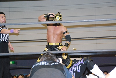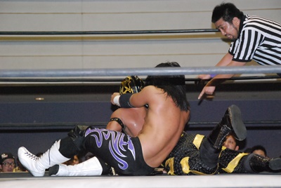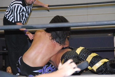 HUBビクトル投げから変形の逆片エビ(右写真)、絞り上げてからエビ固めに、カウント2。
