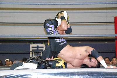 HUB足をすくってレッグロックからステップオーバートーホールドに(右写真)。佐々木切り返してブレーク。