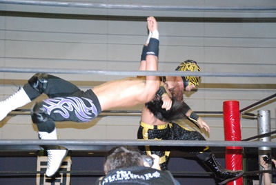 HUB場外に出してブレーンバスター(左写真)。リングに戻す際には「俺もボリビア行きたかった!」