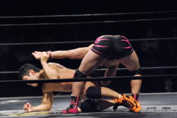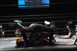 高梨は石井の下をくぐるような形で切り返す(右写真)。石井切り返してハンマーロックからヘッドロック、フライングメイヤー、高梨ヘッドシザーズでブレーク。両軍タッチ。