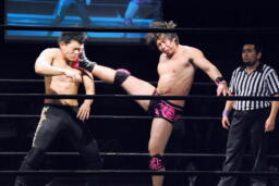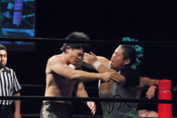 石井もボディスラム連発、カバー、カウント2。遠藤エルボー(右写真)、石井もエルボー。