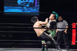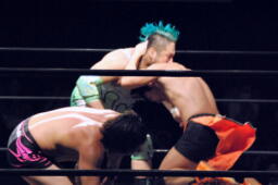 入江ボディスラム、遠藤着地してロープに飛ぶとランニングエルボー、突っ込んで来た入江に当たりは微妙ながら(左写真)高梨にタッチ。