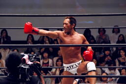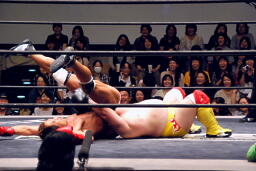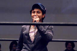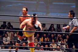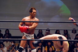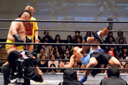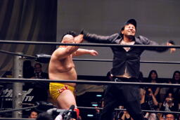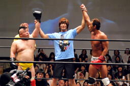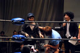 飯伏はリングサイドで撮影していた今成夢人をリングに引っ張り上げる(右写真)。